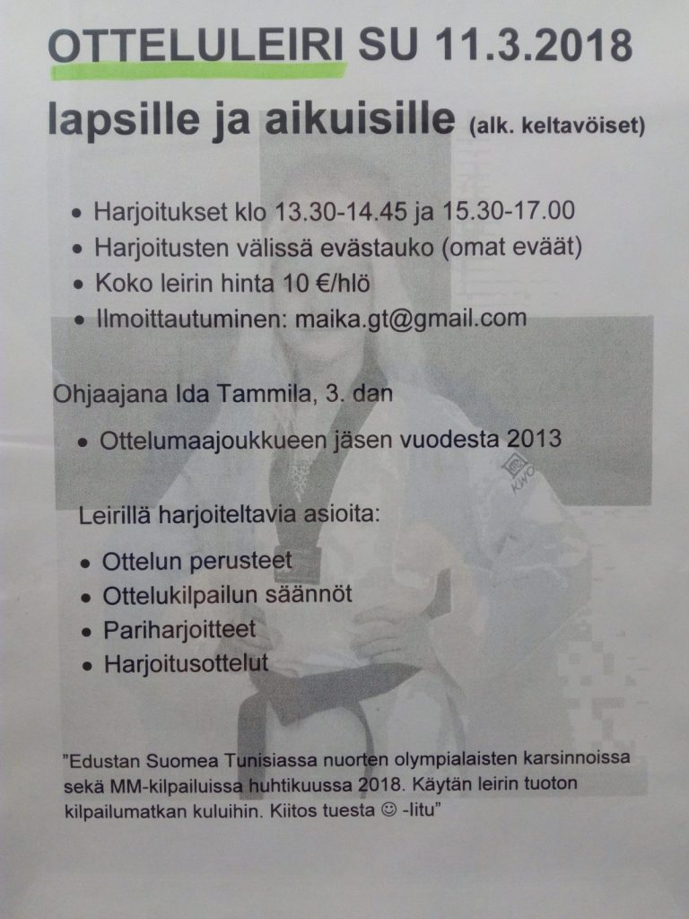 Taekwondoliiton valmennuskeskus järjestää harrastajille kohdistetun potkuleirin Kamppailukeskus Budokwaissa la 6.1.2018. Osallistumiseen ei ole tasovaatimuksia, sillä leiri on tarkoitettu kaikille, jotka haluavat kehittää potkutaitojaan.