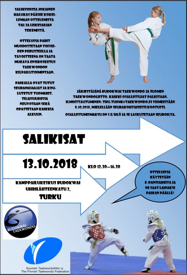 Syysloman harjoitusajat Syyslomaviikolla 15.10-21.10 Harjoitukset järjestetään täysin normaalisti Kamppailukeskus Budokwain, Varissuon, Pallivahan ja Ruskon harjoituksissa. Haarlan koululla ryhmät yhdistetään klo 15.15-16.15 harjoituksiin, eli jatkoryhmä harjoittelee alkeisryhmän kanssa yhdessä. Tervetuloa treeneihin! 🙂
