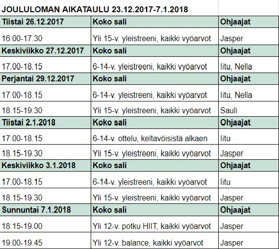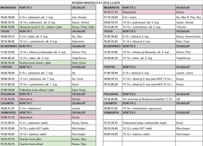 Kevään harjoituskalenteri on pääosin valmis ja se on voimassa 8.1.2018-3.6.2018. Vielä saattaa jokunen apuohjaaja tulla mukaan, mutta varsinaisen sisällön ei pitäisi enää muuttua.
