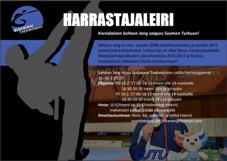 Haluamme järjestää harrastajillemme ja kaikille halukkaille parasta mahdollista ohjausta. Tällä kertaa tämä tapahtuu liikesarjaleirin muodossa, johon ohjaajaksi saapuu taekwondon synnyinmaasta Koreasta SeHoon Jang. Hän on vuoden 2008 maailmanmestari ja vuoden 2015 universiadien kultamitalisti. SeHoon Jang on ollut myös Perun menestyksekkään…