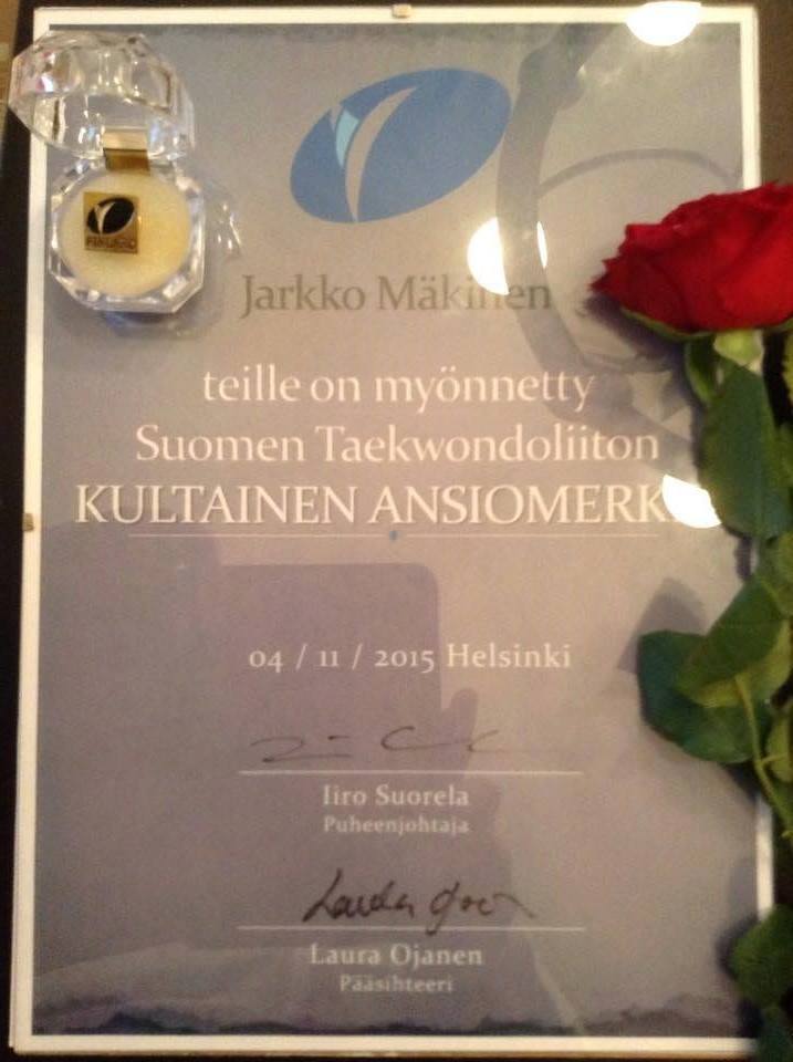 Budokwai Taekwondon pääopettaja, Jarkko Mäkinen 6. dan, palkittiin 5. joulukuuta 2015 Suomen Taekwondoliiton kultaisella ansiomerkillä. Kultainen ansiomerkki myönnetään vähintään 20 vuotta jatkuneesta työstä suomalaisen taekwondon hyväksi.