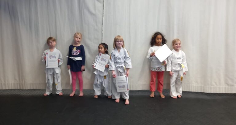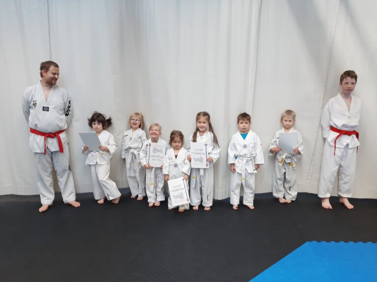 Maanantaina 20.12. järjestettiin tkd-liikkarissa seuramme tämän vuoden viimeiset vyökokeet. Pienet harrastajamme olivat kaikki reippaita ja kotiin viemisiksi he saivat keltaiset natsat sekä diplomit syyskauden harjoituksista. 9. kup Noel Neulanen Senni Piipponen Adele Helle Josefina Jalonen